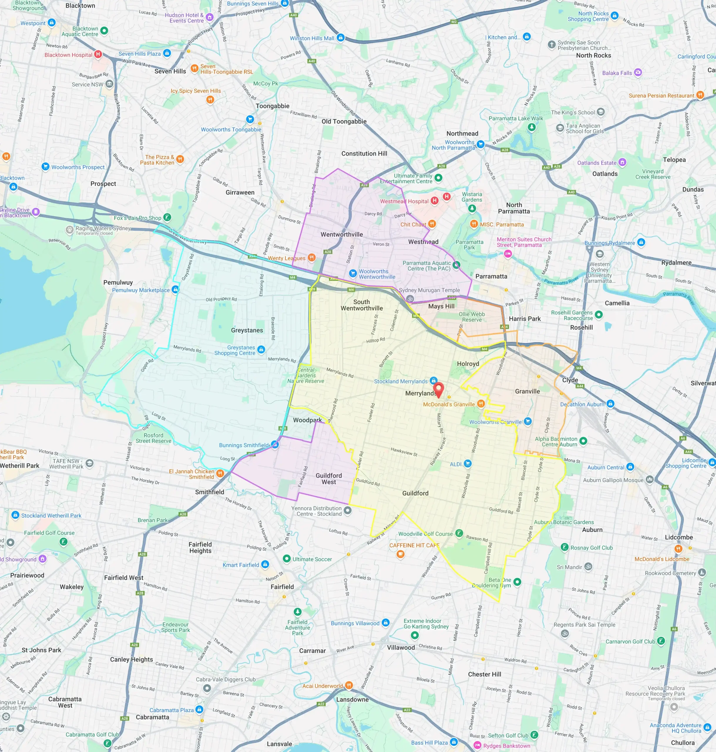 ⦿ Merrylands, Merrylands West, Holroyd, Guildford, South Wentworthville, Min – $25.00, Fee – $3.00